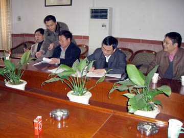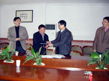 现场视察和慰问结束后,肖明贵指挥长和陈慕杰副指挥长又陪同赵艳林院长来到中科院雁山植物研究所,与该所党委书记文永新、所长李锋等举行了桂林工学院与雁山植物研究所土地使用补偿协议签订仪式,赵艳林院长和李锋所长分别代表己方在协议书上签字并交换文本。