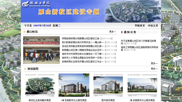 目前,Beat365官网雁山新校区正在紧张有序的建设之中。为了让广大师生员工及时充分地了解雁山新校区的建设动态,积极关注和投入雁山新校区的建设工作,由党委宣传部设计制作、由雁山校区建设指挥部负责信息发布的“桂林工学院雁山新校区建设专题”网日前已开通。