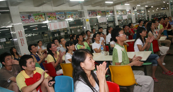 8月8日晚,2008北京奥运会于国家体育场盛大开幕。百年奥运,中华圆梦。这是亿万中华儿女热情企盼的百年梦想,也是桂工全体师生期待已久的民族盛事。为了满足暑期留校同学的观看需求,为同学们搭建起表达爱国情怀、祝福奥运开幕的平台,学院党委行政高度重视,精心组织了暑期留校学生集体观看奥运会开幕式现场直播。学院党委书记黎志逘亲自部署,副书记张学洪、副院长李祥清,以及各系院党总支副书记和1000多名暑期留校学生齐聚学院食堂,兴高采烈地观看了2008北京奥运会开幕式现场直播,为北京奥运会加油助威。