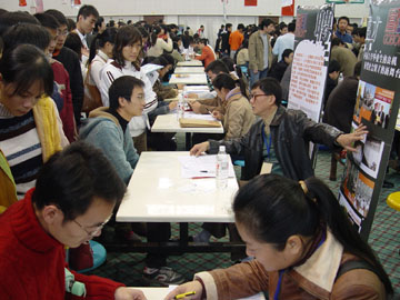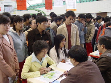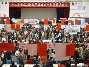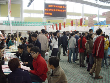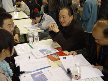 11月25日上午,我院体育馆三楼人头攒动,学院2007届毕业生第一次双选洽谈会在此举行。来自全国各地的100多家用人单位参加了洽谈会,提供了700多个工作岗位(很多用人单位在专业和人数上未作限制),其中有色地矿类、资源勘查类、化工类、旅游管理类所占比例较大。经过严格面试,目前用人单位已同100余名毕业生签订了用人协议。 此次洽谈会,学院领导十分重视,学院党委副书记张学洪亲临现场了解情况。另悉,我院2007届毕业生总计4719人,分布在硕士研究生、本科、专科三个层次。