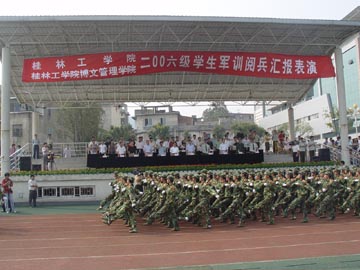 秋高气爽,桂花飘香,屏风山下,绿茵场上,桂林工学院、桂林工学院博文管理学院2006级学生军训阅兵汇报表演于9月27日上午在学院运动场隆重举行。 出席军训阅兵汇报表演的来宾有:桂林空军学院政治部主任黄增庆,广州军区综合训练基地训练部政委付忆民,武警桂林市支队副支队长吴登培,桂林市七星区武装部副部长李香伟,桂林电子科技大学副书记梁丁丁,桂林医学院副院长罗放,桂林师范高等专科学校党委办公室主任伍国祥,桂林旅游高等专科学校学工处处长刘克生,桂林航天工业高等专科学校学工处副处长肖阳。学院领导有:党委书记黎志逘,院长赵艳林,副院长周德俭、阮百尧。军训阅兵汇报表演由我院武装部部长崔光仁同志主持。 奏完庄严的国歌后,阅兵、分列式正式开始。学院党委书记黎志逘在武警桂林市支队副支队长、军训团团长吴登培的陪同下,进行了阅兵。由3522名新生组成的28个男女方队参加了本次军训汇演。身穿统一迷彩服的他们,动作整齐,英姿飒爽,口号响亮,目光坚定,士气饱满,挥动的臂膀有力坚定,踏出的步伐整齐稳健,朝气蓬勃地走过主席台向首长致敬。 参加汇报表演的有女子擒敌拳、男子擒敌拳、女子队列操、班组反劫持战斗行动以及军训教官擒敌团体操。他们个个精神抖擞,英勇果断。勇猛有力的横踢、侧踢、勾拳、连击、别臂、弹踢,看起来真是行如猛虎,站如泰山。他们的精彩表演得到了首长和领导们的肯定,赢得了在场同学的热烈掌声。教官的表演更是精彩,他们动作娴熟、基本功扎实,操练虎虎生威,展示了武警部队威武之师、文明之师的良好形象。 随后举行了2006级学生军训先进集体和先进个人颁奖仪式。 武警桂林市支队吴登培中校发表了讲话。他首先对这次军训取得的成绩予以了充分的肯定,希望同学们把这次军训中好的传统、好的作风运用到今后的学习、工作、生活中去,努力培养服从命令、严守纪律、雷厉风行、勇敢顽强的作风。刻苦学习,圆满完成学业,在大学这个熔炉中百炼成钢,早日成为国家建设的栋梁之材。 学院副院长周德俭在讲话中希望同学们在以后的学习和生活中,将军训中培养的好思想好作风,团结友爱、自强不息、奋发向上、顽强拼搏、严守纪律的精神风貌,带到今后的学习和生活中去。希望大家做到与时俱进,弘扬桂工精神,做一个理想远大、热爱祖国的人,追求真理、勇于创新的人,德才兼备、全面发展的人,为推进学院的全面建设和发展,为祖国更辉煌的明天而奋发图强。 最后,本次军训阅兵汇演在雄壮的军歌中圆满结束。