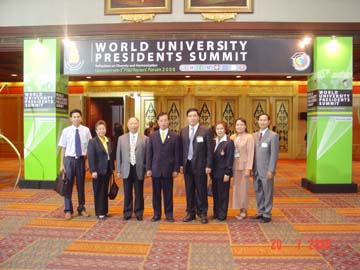 应泰国教育部和泰国皇家理工大学的邀请,学院党委阳国亮书记及国际交流处副处长陈文乾一行二人于2006年7月20日至7月22日 参加了由泰国教育部和泰国皇家理工大学等高校共同举办的世界大学校长峰会。 大会由泰国教育部部长主持,泰国总理他信(Thaksin Shinawatra)出席了大会并致开幕词。来自世界八十多个国家的一千多名代表出席了大会。香港前总督、现任英国牛津大学校长彭定康(Christopher Patten)爵士应邀在会上作了题为“二十一世纪世界高等教育面临的机遇和挑战”的主题讲座。阳书记一行还参加了“高等教育管理”、“教育创新方向”等三个专题讨论会,并就相关问题和与会代表进行了深入的讨论。 与会期间,阳书记还与韩国韩东大学校长金泳吉(Kim Yong-Gil)博士、泰国朱拉隆功大学校长昆英(Khunying)博士和英国利物浦大学校长庄蒙德.邦恩(Drummond Bond)教授分别就双方开展合作交流的可行性进行了会谈。 在泰国期间,访问团一行还应邀访问了泰国皇家理工大学、迈卓大学(Maejo University)、清迈大学(Chiang Mai University)和泰国皇母后大学(Mae Fah Lung University)等几所知名高校,并看望了曾在我院留学的泰国学生。