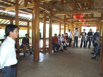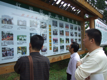 红岩村支书朱培铭同志(左一)介绍红岩村新农村建设情况