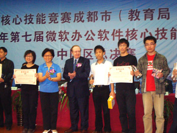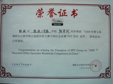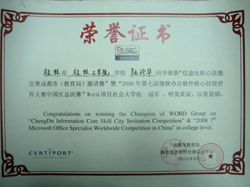 5月4日,2008年第七届国际办公软件核心技能世界大赛MOS(Microsoft Office Specialist)中国区总决赛在成都四川大学圆满落下帷幕,当日举行了隆重的颁奖典礼,成都市人大常委会副主任童若春、副市长傅勇林、市政协副主席杨兴平,微软培训全球授权机构美国思递波全球副董事长兼大中华区总管理处主席Randy Pierson,美国思递波亚太地区总经理Moses,美国思递波亚太地区全球渠道发展经理Scott,美国加州大学博士后、台湾师范大学博士生导师、微软办公软件全球认证中心全球资深顾问戴建耘教授和思递波大中华区总管理处副总经理颜家宇先生等出席颁奖仪式。 我院在此次大赛中表现突出,取得了Excel项目大学组冠军院校、PPT项目冠军院校2个集体奖项和5个个人奖项。为了提高我院家庭经济困难学生的就业竞争力,我院勤工助学公司一直与桂林市微软认证中心联合开展微软核心办公软件培训,并从PHE项目中拿出资金资助部分家庭经济困难学生参与培训,我院博文管理学院和管理学院的陆珍华、陈华钊、罗海军三名同学就是因在培训中成绩优异而被桂林市微软认证中心选送参加本项竞赛的中国区总决赛,并在比赛中分别获得“Word项目大学组冠军”、“PPT项目冠军”、“Word项目大学组亚军”。 此次大赛共吸引了包括清华、北大、上海交大等名校在内的全国30余个城市300余所院校的450名学生和老师参加。我院选手在此次大赛中获得多个奖项,成绩喜人。其中陆珍华同学将与其他三名冠军选手一同代表中国参加7月份在美国夏威夷举办的全球世界大赛,参赛费用全部由美国微软公司承担,预计将有60多个国家选手角逐奖牌,我们期待着陆珍华同学在即将到来的世界大赛中再创佳绩。