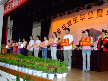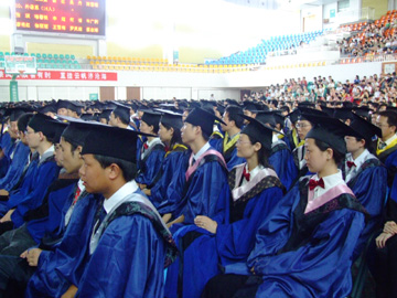 6月26日上午,学院2006届毕业生毕业暨学位授予典礼在体育馆三楼隆重举行。学院学位委员会成员、学生工作干部以及院本部全体毕业生2000余人参加了典礼。在主席台就座的院学位委员会成员有:学院党委书记阳国亮,院长赵艳林,党委副书记唐善茂、张学洪,副院长周德俭、阮百尧、肖明贵,研究生处处长刘康怀,科技产业处处长邹正光,资环系主任解庆林,土木系主任陈学军,电计系主任牛秦州,管理学院院长周永生,旅游学院院长程道品,艺术系主任常新航,人文社科系党总支书记梁军,成人教育学院院长吴郭泉,应用技术学院院长陈先华。 大会由张学洪副书记主持,阳国亮书记发表了热情洋溢的讲话。他首先代表学院党委和行政向我院2006届3000多名毕业生表示衷心的祝贺,同时向为他们的成长付出辛勤汗水的教职工表示崇高的敬意。在回顾了毕业生们在校学习期间所取得的成绩以及为母校建设和发展所做出的积极贡献后,他向毕业生们提出了三点要求:一要扎根基层,勤奋工作,报效祖国,服务社会;二要团结协作,诚实守信,抓住机遇,奋发进取;三要勤奋学习,知行合一,大胆实践,开拓创新。他说,走过50年风雨历程的桂工正在为创建高水平的教学型大学而努力奋斗,学院 “两申”目标的实现固然要靠在校师生员工的艰苦奋斗,同时也离不开社会各界特别是校友们的关心、支持和帮助,希望毕业生们以后要一如既往地关注母校的发展,多为母校出谋划策,多为母校与社会的联系牵线搭桥,在前进的道路上,相互支持、共同发展。最后,阳书记代表学院全体师生员工衷心祝愿毕业生们在新的征途上,事业有成、宏图大展、前程似锦! 阳书记讲话后,教师代表程小辉、在校生代表王卡、毕业生代表谷丽敏先后发言。 在唐善茂副书记宣读自治区和学院关于表彰2006年度优秀大学毕业生的决定,周德俭副院长宣读我院广西自治区选调生、志愿服务西部计划和西藏就业毕业生名单后,学院领导为他们颁了奖。 大会的最后一项议程:学位授予仪式,在阮百尧副院长宣读2006届毕业生毕业资格和学位资格审查报告后举行。我院2006届已完成全部学业获得毕业资格的毕业生有3183人,其中硕士研究生92名,本科生1923名,高职高专生1168名。他们当中有92人获得硕士学位,1877人获得学士学位;有8名被上海同济大学等录取为博士研究生,有146名被武汉大、同济大学、浙江大学等院校或研究单位录取为硕士研究生,有62名高职高专生获得专升本资格。 毕业典礼后,学院领导与毕业研究生以及优秀毕业生们合影留念。