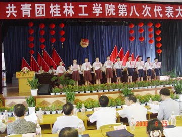 上午九时,大会在庄严的国歌声中正式开始。学院党办、院办副主任耿俊茂致大会开幕词,共青团桂林市委书记刘迎春致贺词。学院第七届团委书记江云清作了第七届委员会工作报告,对四年来我院共青团的工作进行了回顾和总结。一是加强团的思想建设和组织建设,努力提高青年学生思想政治素质;二是积极开展校园文化活动,充分发挥校园文化育人作用;三是积极开展课外学术科技活动,努力培养大学生科技创新素质;四是不断丰富社会实践形式,充分发挥实践育人作用;五是发挥群团优势,积极为学院评估作贡献;六是大力加强社团阵地建设;七是积极组织青年教工活动,不断增进青年教工的联系与交流。江云清还在报告中总结了工作中存在的问题与不足,并对新一届委员会提出了建议和期望。