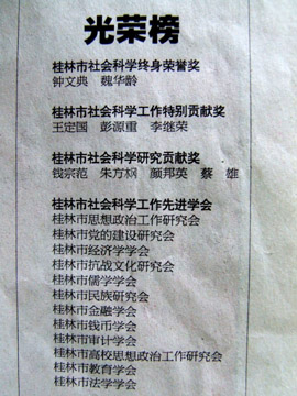 在庆祝桂林市社科联成立20周年之际,为总结经验,表彰先进,推动工作,日前,桂林市社会科学联合会颁发了《关于授予桂林市社会科学终身荣誉奖、桂林市社会科学工作特别贡献奖和桂林市社会科学研究贡献奖的决定》(市社科字[2005]23号),我院蔡雄老教授荣获“桂林市社会科学研究贡献奖”。