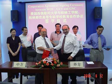 6月12日上午,我院党委书记阳国亮与美国西俄勒冈大学校长john minhan在桂林市高新开发大厦签署了“2+2”合作办学协议。此次合作办学涉及的专业主要有计算机技术、经济学、管理学和信息系统等。 签字仪式由桂林市高新区管委会副主任王朝胜主持,桂林市政府副市长陈建军出席了签字仪式并发表了讲话。