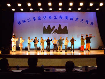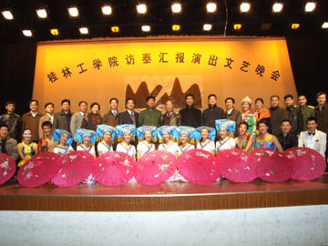 12月9日晚7:30,桂林工学院访泰汇报演出文艺晚会在体育馆三楼隆重举行。学院党委阳国亮书记、副院长周德俭、副院长阮百尧、桂林市出入境检验检疫局张正平局长、阳明祥主任,桂林市旅游局的李志刚局长、彭元力副局长等,桂林边防检查站的岑楚华政委、陈家安副站长以及我院各职能部门、各系(院)的领导来到了晚会现场。此外,晚会还邀请到了广西电视台、桂林电视台、桂林日报等媒体。