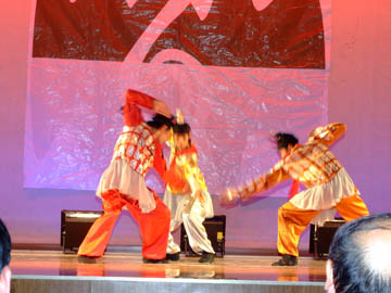 李君、蔡茂军老师深情演唱的《放马山歌》赢得了全场观众的掌声和欢呼声,他们高亢、激扬的嗓音久久回荡在体育馆内,晚会的现场气氛也达到了高潮。院团委万千老师以家户喻晓的祝英台形象,为观众上演了中国古典舞《书苑情话》,演绎了一段深苑里的“单相思”,赢得了观众的阵阵掌声。