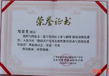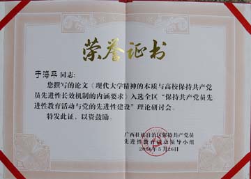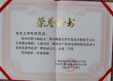 日前,广西壮族自治区保持共产党员先进性教育活动领导小组颁发文件《关于表彰我区“保持共产党员先进性教育活动与党的先进性建设”征文活动获奖论文的决定》(桂先组通字[2006]5号),公布了在此次征文活动中的获奖论文、入选论文及作者名单。 此次征文活动由自治区先进性教育活动办公室、自治区党委组织部、自治区党委宣传部、自治区党委政策研究室和广西党的建设研究会联合举办,时间自2005年10月至2006年3月,共计收到各地各部门推荐的论文1418篇。经过层层筛选、专家评选、领导把关,最终确定入选全区理论研讨会论文126篇,我院共提交论文3篇,全部入选。其中我院党委书记阳国亮研究员提交的论文《建立党内民主参与制度 保持党的先进性》荣获一等奖,由阳国亮书记任课题组组长的桂林工院课题组提交的《努力构建大学生党员全程化全方位长效教育机制》获三等奖,我院党委宣传部、统战部部长于海平提交的论文《现代大学精神的本质与高校保持共产党员先进性长效机制的内涵要求》进入入选论文。