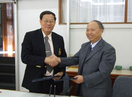桂林工学院党委书记阳国亮(左)与泰国兰实大学签定合作联合办学协议