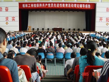 2005年8月25日下午,我院按照先进性教育活动实施方案的总体部署,在体育馆三楼召开保持共产党员先进性教育活动理论辅导报告会,学院全体党员约1100人参加了报告会,报告会由学院党委副书记唐善茂同志主持,学院党委书记阳国亮同志第二次给全院党员作保持共产党员先进性教育活动理论辅导报告,报告内容为新时期共产党员先进性的内涵及其基本要求。 阳书记的辅导报告包括三个方面的主要内容:一、新时期共产党员先进性的内涵;二、新时期共产党员先进性的基本要求;三、新时期共产党员先进性在桂工的具体体现和具体要求。 阳书记在报告中指出,共产党员的先进性就是党员个人或党员群体在认识世界和改造世界的活动中,在思想理论等方面所体现出来的与一般群众相比较能自觉地适应生产力发展要求,符合人类社会发展规律和进步趋势的行为和特征;是共产党员所表现出来的不同于普通群众并发挥先锋模范带头作用的基本性质。在新世纪新时期,要深刻理解、准确把握和努力践行胡锦涛同志在1月14日召开的新时期保持共产党员先进性专题报告会上提出共产党员保持先进性的六条基本要求。阳书记结合学院的具体情况,阐述了新时期共产党员先进性在桂工的具体体现并提出具体要求。阳书记说,桂林工学院的共产党员的先进性要紧密地与桂工的具体工作联系起来,与每个共产党员的具体岗位联系起来,体现在日常的工作和生活之中,要做到以下1、坚定理想信念,振奋革命精神,脚踏实地地推进桂工新世纪新时期新的跨越发展,坚定不移地实现中共桂林工学院第二次代表大会确定的总体目标。2、认真努力学习,提高思想理论水平,每个共产党员都应具备本岗位、本专业的高水平的业务能力。3、牢记党的根本宗旨,贯彻群众路线,将为人民服务的宗旨落实到每个共产党员负责的各项工作中去。4、勤奋高效工作,创一流工作业绩,在学院的各项工作中发挥先锋模范作用。5、严格党的各项纪律,坚持民主集中制,切实维护桂工党组织的团结统一。党的纪律是实现事业发展的保证。6、务必保持谦虚谨慎、艰苦奋斗的优良作风,励精图治、艰苦创业,将桂工精神继续发扬光大。阳书记强调,开展保持共产党员先进性教育活动是一项重大的政治任务,也是统一全院思想,凝聚全院力量,实现桂林工学院新的跨越发展的一次重大机遇。全体共产党员积极努力投入到这次教育活动中,加强认识、提高素质、服务群众、促进工作,努力实现学院各项目标,为推进桂林工学院跨越式的发展做贡献。