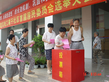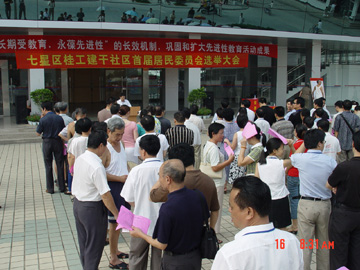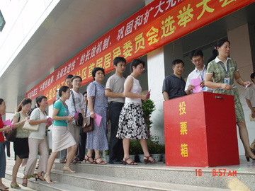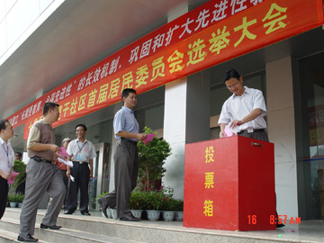 7月16日,首届桂工建干社区居民委员会通过民主投票选举后正式产生。 本次投票选举采取无记名方式,并实行公开投票、唱票、记票,公开开启票箱;3个投票点分别为学院体育馆、东城小区和民族基础教学部,另外,为方便因病不能到投票点投票的居民们行使自己的民主权利,还设立有流动投票箱。 上午8点多,社区居民们就顶着似火的骄阳来到了投票点,等待着投出自己庄严的一票。投票开始前,学院院长赵艳林在选举大会的主会场上发表了讲话。他希望广大社区居民们要充分利用宪法赋予自己的民主权利,选出最合适的首届桂工建干社区居民委员会成员;同时,也希望即将产生的社区居民委员会成员们要认真履行自己的职责,扎实工作,开拓进取,全心全意地为社区居民服务,切实维护好居民们的合法权益和社区的稳定,为构建文明和谐、安定有序的社会主义和谐社区,为学院的建设和发展而努力奋斗。随后,三个投票点按规定的时间进行了民主投票。 下午4点多,东江街道办事处副主任郭文金等同志来到了选举主会场,公开开启全部票箱。经过认真而紧张的记票、算票,首届桂工建干社区居民委员会正式产生,构成如下:何锦色任主任,苏中敏任副主任,委员为韦庆欢、奉远福、胡美春。