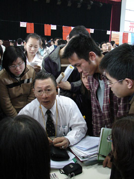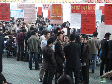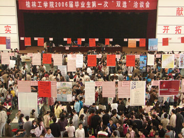 2005年11月26日,我院2006届毕业生第一次“双选”洽谈会在体育馆三楼举行。到会的用人单位共有70家,其中省外用人单位35家,桂林本地用人单位35家。共提供岗位604个,其中研究生33个;本科497个,资环系257个,土木系116个,材化系8个,电计系16个,管理学院64个,外语系11个,艺术设计系13个,旅游学院12个;专科74个。上千名学生参加了此次“双选”会。 据招生就业处副处长熊英介绍,我院2006届毕业生总计3821人,其中研究生96人,本科2449人,专科1276人。此次洽谈会需求专业面共43个,比往年要广,新增了10个,如:资源环境与城乡规划、工程管理、国际经济贸易、自动化等。2006年4月2日,我院将举行第二次毕业生“双选”洽谈会。