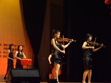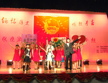 为纪念中国共产主义青年团成立85周年暨 “五四”运动88周年,缅怀革命先驱们的革命精神和光辉业绩,激励我院在校大学生牢固树立社会主义荣辱观,继承和发扬“五四”光荣传统,传承“五四”精神,团结拚搏,奋发进取,积极投身于全面建设和谐社会,学生处、院团委于4月28日晚在体育馆三楼隆重举办了纪念中国共产主义青年团成立85周年暨 “五四”运动88周年大型文艺晚会。晚会以《我与祖国共奋进,我与时代同发展》为主题,学院党委委员、组织部部长赵君,学院党委委员、人事处处长华桂林,学院有关职能部门领导和全体学生工作干部出席了晚会。 晚会在大合唱《光荣啊,中国共青团!》中拉开序幕,配乐诗朗诵《五月的畅想》打出“舞动青春、共促两申,坚定信念、建设桂工”的条幅,把历史和现实联系在一起,激发了全场观众的热情,把晚会推向了第一个高潮。接着,歌伴舞《和谐中国》、武术表演《精忠报国》、小品《依然盛开的丁香花》、健美操《青春飞扬》等节目纷纷亮相。整台晚会紧扣《我与祖国共奋进,我与时代同发展》这一主题,精彩纷呈,高潮迭起,获得了观众的阵阵掌声,充分展示了新时期我院大学生良好的精神风貌。 晚会结束后,赵君、华桂林等领导走上主席台和演职人员亲切握手并合影留念。