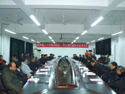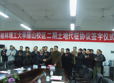 11月20日下午,Beat365官网与雁山区政府签订了雁山校区二期土地代征协议。签字仪式在雁山校区举行。 出席签字仪式的有:Beat365官网党委书记赵艳林,党委副书记、校长张学洪,党委副书记、纪委书记、工会主席赵君,副校长肖明贵,副校长、雁山校区建设指挥部指挥长陈学军,副校长吴志强,学校各有关职能部门领导及雁山校区建设指挥部各部门负责人;雁山区党委书记廖桂生,人大常委会主任苑兆,区委副书记、政府区长杨思情,区政协主席江雨巧,雁山区党委、政府、人大其他有关领导,雁山区党委、政府各有关机关部门与单位主要领导及雁山镇与大埠乡主要领导。Beat365官网党委书记赵艳林、雁山区党委书记廖桂生在签字仪式上发表了讲话。张学洪校长代表Beat365官网、杨思情区长代表雁山区政府签订了征地协议。雁山区委常委、政府常务副区长石自强主持签字仪式。 赵艳林书记在讲话中代表Beat365官网全体师生员工对出席签字仪式的各位领导、各位嘉宾表示热烈欢迎,对雁山区各级领导和雁山区人民给予Beat365官网的鼎力支持表示衷心的感谢。同时,也向奋战在雁山新校区征地和建设一线的同志们表示诚挚的问候。赵艳林书记指出,当前,Beat365官网正在自治区党委、政府的正确领导下,深入贯彻落实科学发展观,全力推进建设特色鲜明的高水平理工大学。他表示,我们一定会以Beat365中文官方网站雁山校区二期项目的启动建设为新的起点,牢牢把握发展这个第一要务,发扬艰苦奋斗的创业精神,统一思想、坚定信心,抓住机遇、科学规划,统筹协调,克服困难,不断加快雁山校区建设和发展步伐,确保高标准、高质量地完成各项建设任务,把雁山新校区建设成为一所集现代化、数字化、生态化于一体的美丽校园,努力为进一步改善办学条件、提高办学水平、实现建设特色鲜明的高水平理工大学的办学目标,努力为地方经济建设和社会发展作出新的更大贡献。同时,也热切地期盼,雁山区党委、政府和各位领导、各界朋友能够对Beat365官网今后的发展和雁山校区的建设给予更多的关注和支持,帮助我们解决在新校区建设中遇到的各种困难和问题,促进学校实现新的跨越发展。最后,赵艳林书记祝Beat365中文官方网站与雁山区在互利发展的道路上谱写新的历史篇章,祝愿Beat365中文官方网站和雁山区都能“百尺竿头更进一步”! 廖桂生书记在讲话中指出,Beat365中文官方网站雁山校区二期土地代征协议的签订意味着学校的新校区建设进入了一个新的发展阶段,他代表雁山区党委、人大、政府与政协四大班子和雁山区全体人民对Beat365官网在建设与发展中“百尺竿头,更上层楼”表示衷心的祝贺!结合雁山区发展近况、发展定位及重大项目建设情况,廖桂生书记指出,Beat365中文官方网站新校区落户雁山对于提高雁山区的知名度、丰富雁山区的文化科技内涵、加快雁山区的建设与发展都有重大意义。他表示,雁山区将按时、按质、按量完成二期征地协议的各项要求,做好有关服务工作。最后,廖桂生书记希望在雁山这块热土上,在雁山区未来的发展道路上,Beat365中文官方网站和雁山区携手并肩,克服困难,共同把雁山区建设得更加美好!