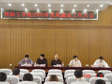 4月26日下午,我院在9501教室召开党风廉政工作会议。会议由审计室副主任黄日辉主持,学院副处级以上领导干部参加。党委书记阳国亮,党委副书记唐善茂、张学洪,副院长李祥清、肖明贵等学院领导出席了会议。 在会上,唐善茂副书记传达了中纪委、自治区纪委和广西高校纪工委党风廉政建设会议的有关精神,通报了2004年度学院各党总支、直属支部以及学院副处级以上干部贯彻党风廉政责任制情况,并就2005年学院纪检、监察工作进行了部署。唐副书记强调,党风廉政建设关系到领导干部在工作中能否始终做到执政为民,也直接关系到学院的建设与发展,关系到领导干部个人的成长,他要求大家必须高度重视党风廉政建设工作。纪委副书记、审计室主任石柱鑫向与会同志介绍了审计工作的基本知识,汇报了近几年审计工作的情况,并提出了2005年审计工作的思路和计划。随后,学院领导阳国亮、唐善茂、张学洪、李祥清和肖明贵分别与管理学院、工会、招生就业处、民族基础教学部和数理系负责人签定了廉政建设责任书。 党委书记阳国亮作了重要讲话,要求与会同志要在今后工作中认真贯彻执行唐副书记和纪委关于党风廉政建设的要求,并希望大家对于党风廉政建设一要充分重视,不可掉以轻心;二要时刻警醒自己,按照责任状与有关规定,经常对自己进行监督;三要认真学好用好学院纪委发放的宣传教育材料,经常提高自己;四要逢事不忘廉政,在检查、总结等工作中,必须把廉政建设内容列入其中;五要正确对待审计,积极配合做好审计工作。