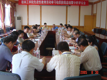 会议由学院保持共产党员先进性教育活动领导小组办公室主任、组织部部长赵君同志主持,学院党委书记阳国亮同志,先教办副主任莫坷、陆平同志,各党总支书记、直属党支部书记参加了会议。会议首先由各党总支书记、直属党支部书记汇报第一阶段后期的工作情况,主要是开展共产党员先进性岗位标准大讨论和桂工精神大讨论的情况;接着,先教办副主任陆平同志强调了第二阶段的具体做法和要注意的主要问题;先教办主任赵君同志具体强调了第二阶段必须注意的政策问题和传达了自治区高校先教办主任会议的精神;最后,阳国亮书记对第一、第二阶段的工作作了具体指示:第一、要继续巩固和完善第一阶段的有关工作;第二、要继续保持旺盛的学习精神,抓好第二阶段的学习教育活动;第三、继续加强领导。阳书记对第二阶段的工作作了非常详细而周密的部署。通过参加这次培训班,各党总支书记、直属党支部书记明确了分析评议阶段的意义和任务,掌握了分析评议阶段的政策和原则,把握了分析评议阶段的主要环节和方法,为完成第二阶段的工作任务打下了坚实的基础。