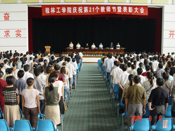 9月9日下午,我院庆祝第21个教师节暨表彰大会在体育馆三楼礼堂隆重召开。大会由学院院长赵艳林主持,学院党委书记阳国亮,党委副书记唐善茂、张学洪,学院副院长周德俭、李祥清、肖明贵出席了大会并在主席台上就座,全院教职工参加了大会。 在大会上,唐善茂副书记宣读了《关于表彰2004-2005年度“教书育人先进集体”、“优秀教师”、“先进教育工作者”的决定》,随后学院领导为获奖先进集体与个人颁奖。颁奖仪式结束后,先进个人代表资环系教师朱义年作为先进个人代表作了发言,他说,要实现学院第二届党代会提出的新的奋斗目标,就需要学院的每一位教师增强自己的光荣感、责任感和使命感,进一步弘扬“桂工精神”,强化“校兴我荣,校衰我耻”的主人翁意识,在日常的教学工作中,真正做到“爱校如家、不甘人后、艰苦创业、自强不息、团结协作、顾全大局、敬业奉献、开拓创新”,不断为学院的改革、发展和稳定作出自己应有的贡献。他表示,要在新学年中更加努力工作,热爱教育、关爱学生,做让人民满意的教师。社科部德育教研室牟艳娟老师代表先进集体也作了发言。 学院党委书记阳国亮发表了讲话。他首先代表学院党委、行政向在教学、科研、管理、服务等岗位上默默耕耘、无私奉献的全体教职员工致以节日的良好祝愿和诚挚问候,向受表彰的先进集体和个人表示热烈的祝贺,向为我院的发展与建设作出重要贡献的老领导、老教师、老同志致以崇高的敬意,向刚到我院工作的新教师表示热烈的欢迎,同时,还向所有关心、支持、帮助我们的朋友,表示最衷心的感谢。 阳书记还讲了以下三个问题:一是要深入开展以“爱与责任”为主题的师德建设活动;二是认真贯彻落实第二次党代会精神;三是继续深入开展保持共产党员先进性教育活动。他号召全体教职员工,要继承和发扬桂工的优良传统,在全院范围内进一步提倡和发扬新的战略发展机遇所需要的桂工精神,与时俱进,开拓创新,团结奋斗,奋发有为,以学院发展和教育事业的进步为己任,抢抓机遇,乘势而上,以饱满的热情投入到桂工建设发展中去,实现桂工新的跨越发展,谱写新世纪新时期桂工建设发展的新篇章,迎接桂工更为辉煌灿烂的未来。 学院院长赵艳林在大会结束语中希望全院教职员工要认真贯彻落实学院第二次党代会和阳书记的讲话精神,大力弘扬桂工精神,以先进为榜样,努力学习,勤奋工作,为谱写新世纪、新时期桂工建设发展的新篇章,实现桂工新的跨越发展作出更大的贡献。