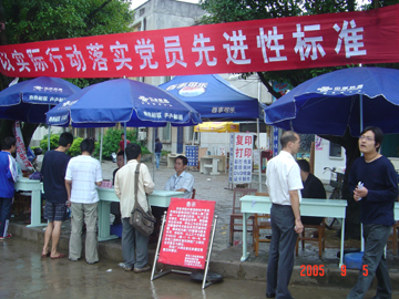 9月5日上午11点至下午4点,在学院保持共产党员先进性教育活动进入第二阶段——分析评议阶段之际,教务处党支部、学生工作处党支部、后勤集团党支部在学院电工房附近面向学院广大师生征求意见与建议。此次活动旨在广泛征求意见,听取师生呼声,帮助三个支部及其党员查找问题,提高相关部门的管理与服务水平,以利于切实解决师生实际问题,使保持共产党员先进性教育活动更加深入地开展,更好地以实际行动来体现共产党员的先进性。