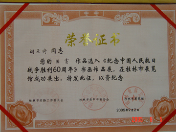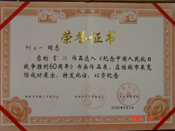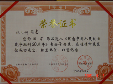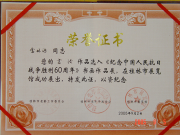 为纪念抗日战争胜利60周年,弘扬爱国主义精神,丰富离退休同志业余文化生活。近日,我院离退休书画协会组织离退休书画爱好者参加了由桂林市老龄工作委员会、桂林市老年书画协会、桂林市展览馆联合举办的《纪念中国人民抗日战争胜利60周年》书画作品展,我院雷林源、张文娜、胡承绮、何于一、王华五位老师的参展作品获荣誉证书。