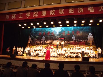 6月29日晚,我院廉政歌曲演唱大赛在体育馆三楼隆重举行,本此大赛由中共桂林工学院委员会主办,学院纪委、党委宣传部、学工部、院工会、团委承办,主题为“树荣辱观,唱正气歌”。来自学院各党总支、直属支部的全体党员组成的15支参赛队伍参加了本次大赛。学院党委书记阳国亮、院长赵艳林、副院长肖明贵作为机关党总支参赛队伍成员参加了比赛。阳书记为大赛致词。 大赛分两个部分进行,第一部分是大合唱比赛,第二部分是独唱与重唱比赛。各参赛队伍选唱的歌曲,多是把音乐艺术与反腐倡廉结合起来的政治性和艺术性俱佳、深受老百姓喜爱的优秀廉政歌曲,这些歌曲旋律优美流畅,再加以各参赛单位精心配以分声部演唱、领唱、诗朗诵、伴舞等各种形式,使每一支队伍的演唱都富有很强的艺术表现力和感染力,让在场观众叫好不绝、掌声连连。 本次大赛实行评委现场无记名打分、现场统分、现场宣布得分结果的评比办法。经过三个小时紧张而又精彩的比赛,比赛结果最终揭晓。大赛评委组组长、学院党委宣传部部长于海平宣布了比赛结果。民教部党总支、离退休党总支获大赛一等奖;外语系党总支,机关党总支,人文社会科学系党总支、应用技术学院、数理系党支部联队获大赛二等奖;资环系党总支,博文管理学院、图书馆、体育教学部党支部联队获大赛三等奖;其他各参赛队获优胜奖。 本次大赛的成功举办,通过充分发挥廉政歌曲教育人、感化人、陶冶人、鼓舞人的作用,对于促进学院良好的反腐倡廉文化氛围的形成、推动社会主义荣辱观教育活动的开展与构建和谐校园,都有着重大的意义。同时,也为庆祝中国共产党建党85周年献上了一份丰盛的贺礼。