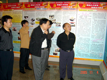 2005年11月4日上午,自治区先进性教育活动第七督导组组长奉江、督导员彭绍关,自治区高校工委督导组联络员唐东升,自治区高校工委督导三组督导员张月光、农荣前,到我院检查工作。督导组的领导首先到体育馆三楼观看了我院开展先进性教育活动工作成果展,接着,到材化系、艺术系检查了整改工作情况,最后,在先教办听取了我院党委书记阳国亮作的工作情况汇报。奉江组长从四个方面对我院的先进性教育工作给予了肯定:一、党委高度重视,三级领导工作到位,责任到位;二、整改工作认真细致,计划周密,措施得力,要求明确;三、在工作方式方法上有创新,如建立党建长效机制很有特色;四、坚持边议边改边整边改取得了实效。
