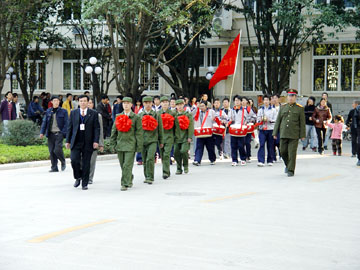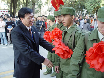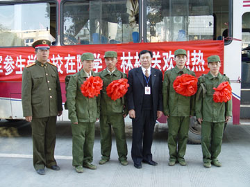 12月10日,我院5名大学生告别母校,踏上了从军之路。这五名学生分别是来自高职学院的陆宇和肖易、材化系的杨绍林、旅游学院的付靖和电计系的黄佳,李祥清副院长和武装部部长李治亲自为他们送行,并与他们合影留念。