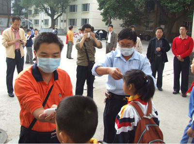 张学洪校长(后排右一)、吴志强副校长(后排右二)到附属小学检查学生体温晨检情况