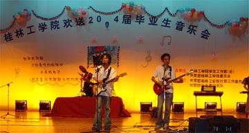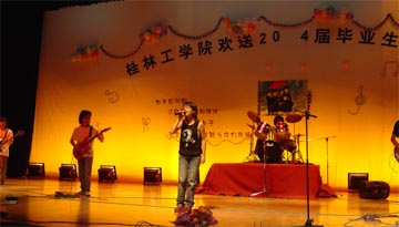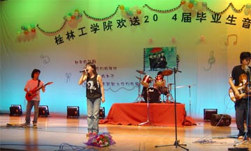 6月24晚8点未到,体育馆三楼的礼堂内已座无虚席,人群拥挤。慕名而至急欲一睹我院著名乐队——星空乐队的师生们已有些迫不及待了,盼着“2004年欢送毕业生文艺晚会”暨星空乐队专场音乐会的开场。 “我们的家乡,在希望的田野上……”《在希望的田野上》拉开了晚会的序幕。接下来,《远方》,《 It’s my life 》星空乐队带来的一首首精彩绝伦的摇滚音乐一次次把大家的激情活跃起来,礼堂里不断爆发起一阵强过一阵的浪潮般的掌声。晚会在星空乐队歌手们的精彩演艺中出现了一次次的高潮。 “当生活到达完美时刻,当花开烂漫时……”嗯?怎么这歌声那么优美?这乐声那么轻柔?这种风格不像是星空乐对啊?原来是一首来之桂电Silense乐队的《完美时刻》。今晚的晚会除了有星空乐队,管弦乐团和我院的另一支新秀乐队——霓虹灯乐队外,同时也邀请了桂电Silense 乐队,师大的丝线普乐队,地教院逆流乐队一起同台演出。来自各兄弟院校的朋友们同样博得了阵阵喝彩的掌声。 《让我走吧》对待新生活我们《勇往直前》,《绽放》自己直到过上《完美生活》,歌声表达了年轻人生活的乐观和勇敢,也深深的表达了对毕业生们的祝愿和祝福。 在一阵纯音乐演奏《友谊地久天长》中晚会落下帷幕,我们今晚《不愿睡去》,让我们同唱一首《缘分之恋》,为大学缘分欢呼,为毕业生们祝福。