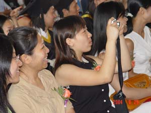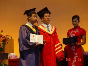 在李祥清副院长首先宣读了《关于表彰2004年度全区普通高等学校优秀大学毕业生的决定》和《关于表彰2004年度学院优秀大学毕业生的决定》之后,获奖同学纷纷走上主席台,从学院领导手中接过沉甸甸的获奖证书。他们当中有2004年广西区的选调生;有服务西部计划的志愿者;有自治区和学院的优秀毕业生代表。