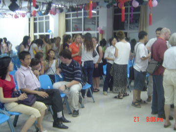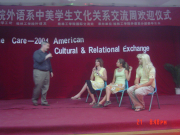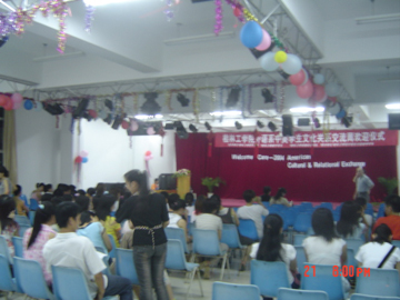 6月21日晚8时,从体育馆附四楼传来阵阵欢声笑语,笑脸在此刻定格,友谊在此刻成为永恒……桂林工学院外语系学生文化关系交流周在此隆重开幕。出席本次开幕仪式的领导有院党委副书记唐善茂老师,院学工部部长梁军老师,院国际交流处处长朱晓媚老师,院团委书记江云青老师,外语系党总支书记张雄老师,外语系党总支副书记范玲老师等。美国访问团一行25人也应邀出席了本次开幕仪式。 首先,院党委副书记唐善茂教授向美国团致了热情洋溢的欢迎词, 对美国访问团的来访表示诚挚地欢迎,并指出此次交流活动的开展具有积极深远的意义,并希望通过这次来访能够加强中美高校的交流和合作,以促进两国的文化交流及学术发展。随后,美国访问团团长Dave也对本次访问活动表示热烈地祝贺,对我院师生的盛情款待表示衷心地感谢,并代表美国访问团向外语系赠送了书籍等礼品,表达了他们对本院师生的深厚情谊。此后,中外双方的精彩表演使本次活动高潮迭起。最后,美国访问团与我院师生合影留念。