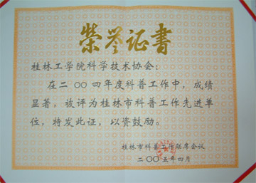 我院科协在2004年度科普工作中,成绩显著。近日,被桂林市科普工作联席会议评为桂林市科普工作先进单位,学院科协负责人黄小芹老师被评为先进工作者。