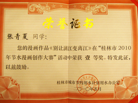 日前,桂林市大中专院校节水漫画创作大赛已成功落下帷幕。Beat365官网艺术学院学生在本次比赛中取得优异成绩,获得一等奖1项,二等奖1项,三等奖3项,优胜奖5项。其中,张青夏同学的漫画作品《别让漓江变离江》获得市级一等奖(一等奖全市共两名),李恒同学的漫画作品《科学用水,珍惜我们共同的水资源》获得市级二等奖。 每年的3月22日是联合国大会确定的世界水日。这一纪念日提醒公众关注日益严峻的水资源缺乏问题,倡导人们合理用水,节约用水。本次漫画创作大赛是由桂林市城市节约用水计划用水办公室主办,大赛的主题是“共创节水社会,构建人水和谐”,此次活动的举办为进一步加大节水宣传工作力度,推进节水型社会建设,充分调动大学生参与节水的积极性,在全社会营造浓厚的节水氛围做出了积极的贡献。