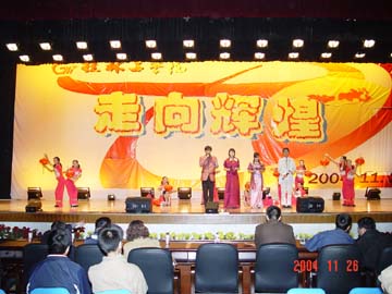 11月26日晚7:30,在学院体育馆3楼,一阵喧天震响的迎宾锣鼓,催开了我院迎评文艺晚会《走向辉煌》节目预演的帷幕,学院党委书记阳国亮、副书记张学洪,各系、部负责人和部分师生观看了演出。 参加此次预演的节目共有14个,分别是《迎宾锣鼓》、歌伴舞《好日子》、音诗画《山谷的风》、舞蹈《追求》、服饰艺术《春风桃李》、舞蹈《花开时节》、舞台剧《风华正茂》、舞蹈《出水莲》、京韵京腔《沁园春 雪》、舞蹈《热切向往》、葫芦丝独奏《美丽的金孔雀》、舞蹈《千红》、男声四重唱《海港之夜》与《森林水车》、舞蹈《走向辉煌》。 预演在一曲《同一首歌》中宣告成功结束,学院党委书记阳国亮、副书记张学洪走上舞台与演员们一一握手致以亲切慰问。全体演员表示要再接再厉,在距正式演出仅剩一天的时间里,找差距、补不足,努力完善、精益求精,确保在正式演出中充分展现我院师生的文艺水平、综合素质和精神风貌。