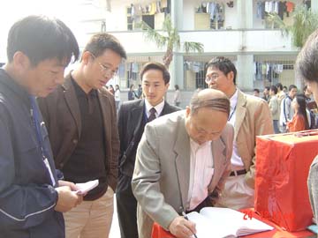 11月23日中午,在学院党委副书记张学洪教授、学院党委学生工作部部长梁军老师和院团委副书记叶昊老师等的陪同下,学院党委书记阳国亮研究员于百忙之中抽出时间到募捐点为电计系学生吕银川同学捐款,代表学院亲切慰问了募捐点的工作人员,具体了解了募捐情况,关切询问了吕银川同学的病情,同时在留言本上刚劲有力地写下了“祝吕银川同学早日康复为努力学习再创佳绩提供良好身体素质”的祝语。 学院领导对我们学生的关怀让我们深深感受到了桂工是一家的温馨,极大鼓舞了全院师生团结协作、凝成一股绳贡献评估。 据悉,到11月23日中午截止,陆陆续续收到师生个人、集体捐款43383.30元。