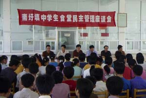 再仔细看下去,情景就有点让人揪心了。一个本该住7、8个人的学生宿舍竟然挤进了16个人,几乎被架子床塞得满满的,过道只有体操比赛中平衡木那么宽,我真弄不懂那么多学生是怎么进进出出的。校长说,这还是好的,还有更差的。接着他领我们看了用木板搭成的简易宿舍,说它简易,真是一点不假,里面是两排大通铺,四面是木版墙,从一指多宽的木版缝隙中可以清楚地看见外面的一切,既不挡风,又不挡雨。校长说,由于南圩镇只有这么一所初级中学,上级要求达到普及九年义务教育的目标,学校不能拒收要求上学的孩子,但由于隆安是贫困县,教育局一时拿不出那么多钱给学校建更多的学生宿舍,所以只能先这样凑合着。