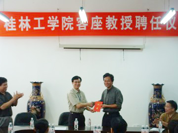 6月14日,浙江大学理学院化学系博士生导师朱岩教授受聘为我院客座教授。聘任仪式在材化系会议室举行,材化系党总支书记胡祖生副教授主持仪式。学院院长赵艳林教授出席聘任仪式。 在材化系主任刘树深教授介绍了朱岩教授基本情况、学术成就后,赵艳林院长向朱岩教授颁发了聘书,并对朱岩教授的加盟表示由衷的欢迎和感谢。朱岩教授表示,他将把自己作为桂工的一员,把这里当作自己的家,要尽最大的努力,促进双方在教学、科研项目等方面的合作交流,为学院的发展做出贡献。 聘任仪式后,朱岩教授和材化系部分师生进行座谈。在座谈中,赵院长肯定了材化系在学科建设上取得的成绩,同时告诫我们要拉紧申博之弦,加快学科建设,引进人才,提高竞争意识和竞争能力,争取早日申博成功。朱岩教授就如何加快我院申博工作进程等问题提出了宝贵意见。