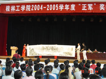 孙正军先生在颁奖典礼上受聘为我院客座教授,并接受学院馈赠的纪念品——桂林山水画。孙正军先生表示:作为桂工校友,感谢母校给予的客座教授荣誉,感谢恩师的教导。他说:“当年国家培养了我,母校造就了我,我就要回报母校、回报国家,希望今天的大学生二十年后能像我这样,回报母校、回报国家的培养。我将一如既往,努力报效祖国、为母校的发展作出自己的贡献。祝母校前程似锦!”