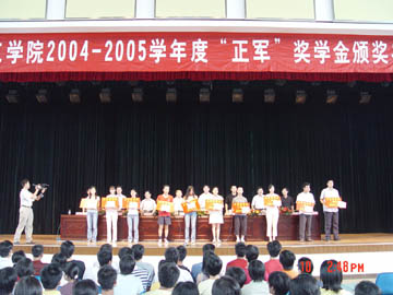 今天是我院贫困生的好日子,校友孙正军捐资30万在我院设立“正军”奖学金,对品学兼优的贫困生给予物质支持、精神鼓励。6月10日下午,2004-2005学年度“正军”奖学金颁奖典礼在我院体育馆三楼举行。院领导、相关部门负责人、学工系统干部、院系班三级学生干部以及获奖学生近2000人参加了本次典礼。我院贫困生中40位一等奖学金获得者每人将得到3000元奖励,90位二等奖学金获得者每人将得到2000元奖励。