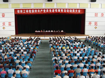根据自治区党委和高校工委的部署,学院作为第二批保持共产党员先进性教育活动单位,从7月份开始在全体党员中开展以“三个代表”重要思想为主要内容的保持共产党员先进性教育活动。7月4日下午4:30分,学院在体育馆三楼报告厅隆重召开保持共产党员先进性教育活动动员大会,就学院开展保持共产党员先进性教育活动进行动员和部署。学院领导、自治区高校工委保持共产党员先进性教育活动督导组桂林片组长李善辉等7位同志,全体在职教职工党员、离退休党员、学生党员以及入党积极分子、民主党派代表、群众代表共计1300多人参加了大会。大会由院党委副书记、院长赵艳林同志主持。