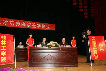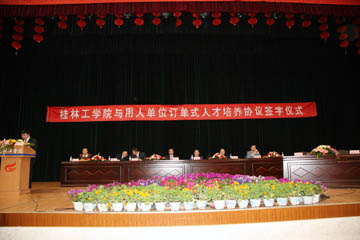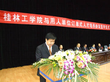 上午11点,桂林工学院与广西测绘局等5家单位的订单式人才培养合作协议签字仪式在体育馆双选会现场举行。学院党委书记黎志逘出席了签字仪式,学院党委副书记赵君主持签字仪式并致辞,学院党委副书记张学洪代表学院分别与广西测绘局、中国石油第六建设公司、钦州港经济开发区管委会、华锡集团、顺德永基建筑基础有限公司的领导签订订单式人才培养合作协议。按照协议规定,学校根据企业的实际需求培养学生,这些学生毕业后直接到签约企业去就业,这样就为实现学校和用人单位在培养人才和使用人才方面进行无缝对接搭建了良好的平台,同时也打造了学校稳定的就业渠道,拓宽了我院学生的就业门路。而与以上广西知名单位签订人才培养合作协议,也提高了我院学生的就业层次。