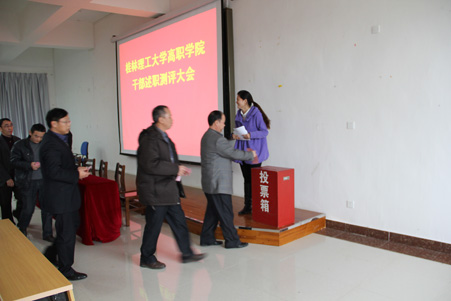 1月4日下午,高职学院2012年度处级领导干部述职测评大会在空港校区8208多媒体教室召开。副校长陈贵英、刘宝臣出席大会,学院党政领导班子及全体教职员工参加。会议由副校长刘宝臣主持。 会上,副校长刘宝臣要求,各位处级领导干部要全面、客观、公正地汇报本人2012年度任职情况,努力为学院各项事业科学发展贡献力量。随后,该院各位处级领导干部分别结合本人工作实际,从德、能、勤、纪、廉、学等方面进行述职报告。 会后,全体与会人员对各位处级领导干部述职情况进行了现场民主测评。