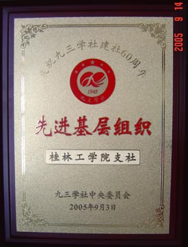 在纪念抗日战争胜利六十周年和九三学社建社六十周年之际,九三学社桂林工学院支社荣获九三学社中央委员会颁发的先进基层组织荣誉称号。