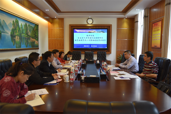 在屏风校区行政楼第二会议室,解庆林校长向潘志金副厅长一行介绍了学校深化高校体制机制改革发展工作基本情况,还就在深化人事体制机制工作中存在的问题、困难以及希望自治区人社厅给予的支持和帮助进行了具体汇报。