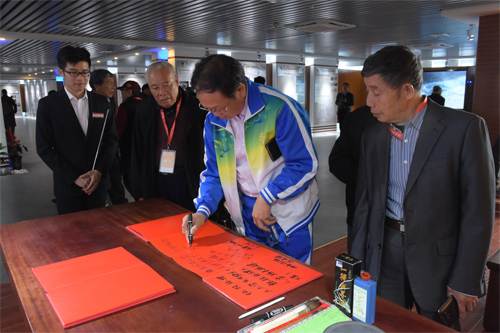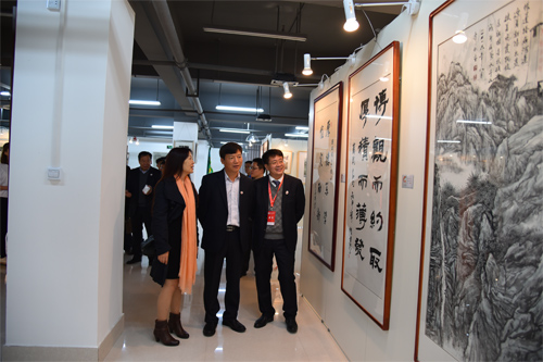 领导嘉宾欣赏艺术学院教师创作的校庆主题书画作品