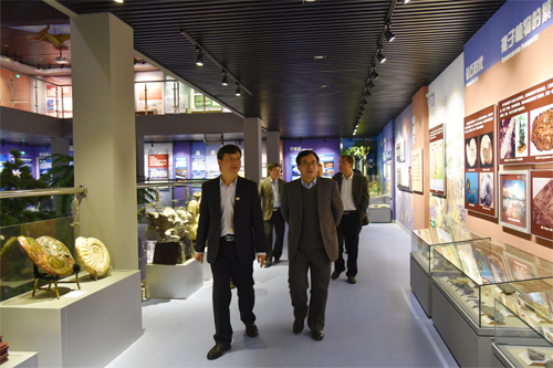 自治区高校工委书记、教育厅厅长秦斌(右三)在张学洪书记(右二)陪同下参观地质博物馆