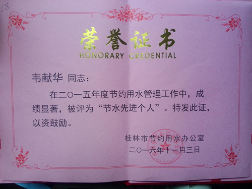 Beat365官网获得“2015年度桂林市节水先进单位”荣誉称号