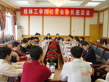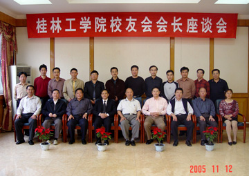 2005年11月11—14日,在距我院50周年华诞倒计时整一年之际,20多位桂工校友会会长和校友代表从全国各地聚会桂林,参加学院发起组织的桂林工学院校友理事会会议。这是我院在45周年校庆之后首次召开的校友理事会议,目的是商讨如何进一步加强各地校友会工作,做好明年50周年校庆筹备工作事宜。